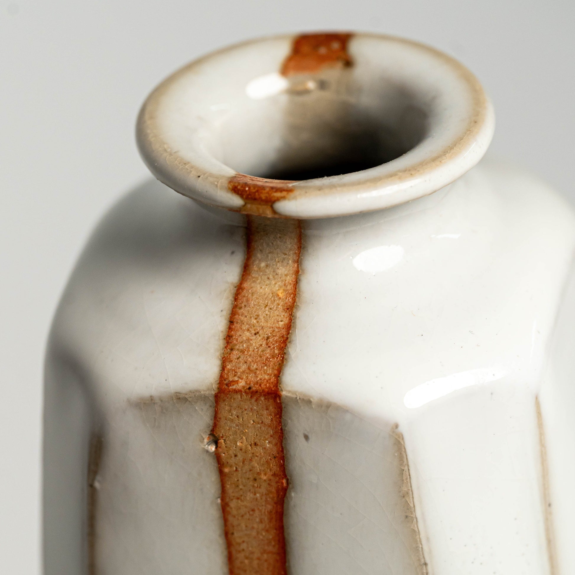 This white Hagi yaki vase features bevelled edges and an exposed orange clay line down the centre on two sides. It is a careful and labour-intensive process to create this vase. It is crafted, carved, and glazed entirely by hand.