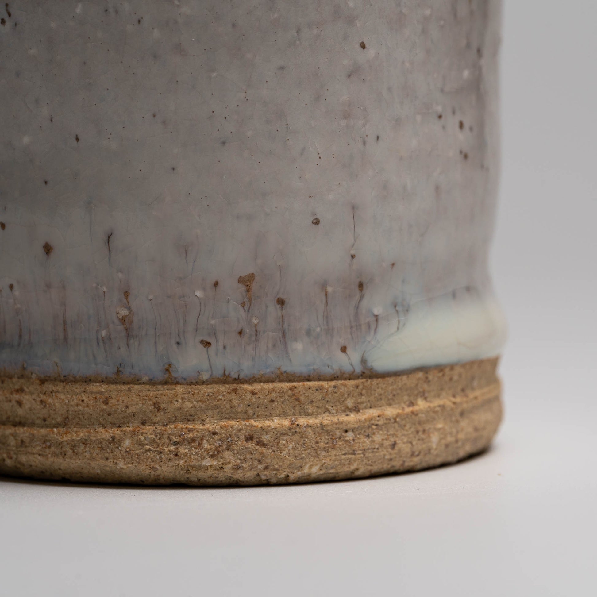 The undulating rim of this beautiful shochu cup is the product of Makino-san's traditional kick wheel method. The slower rotations of a kick wheel create a range of unique, wabi sabi features on his pieces. Makino-san's stray ash glaze covers the vessel and pools at the bottom to create a subtle drip. Upon closer inspection, miniature 'waterfalls' of colour variation can be found across the piece where the minerals in the clay interacted with the glaze during the firing.